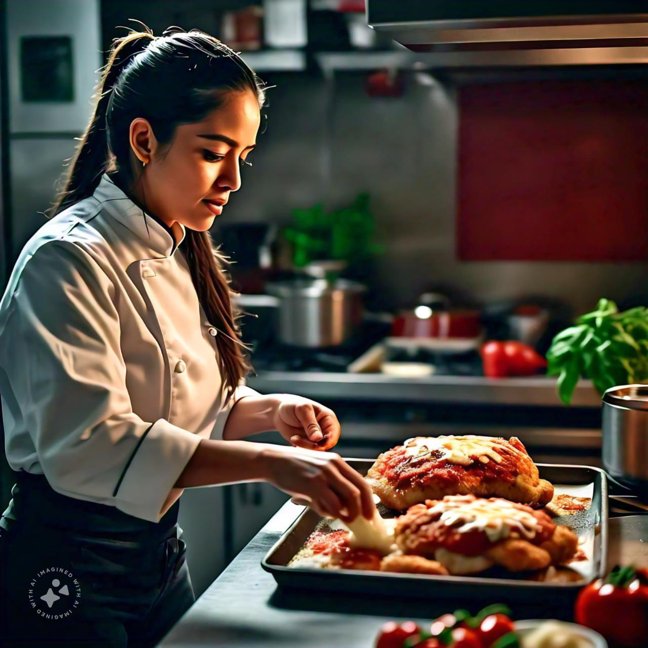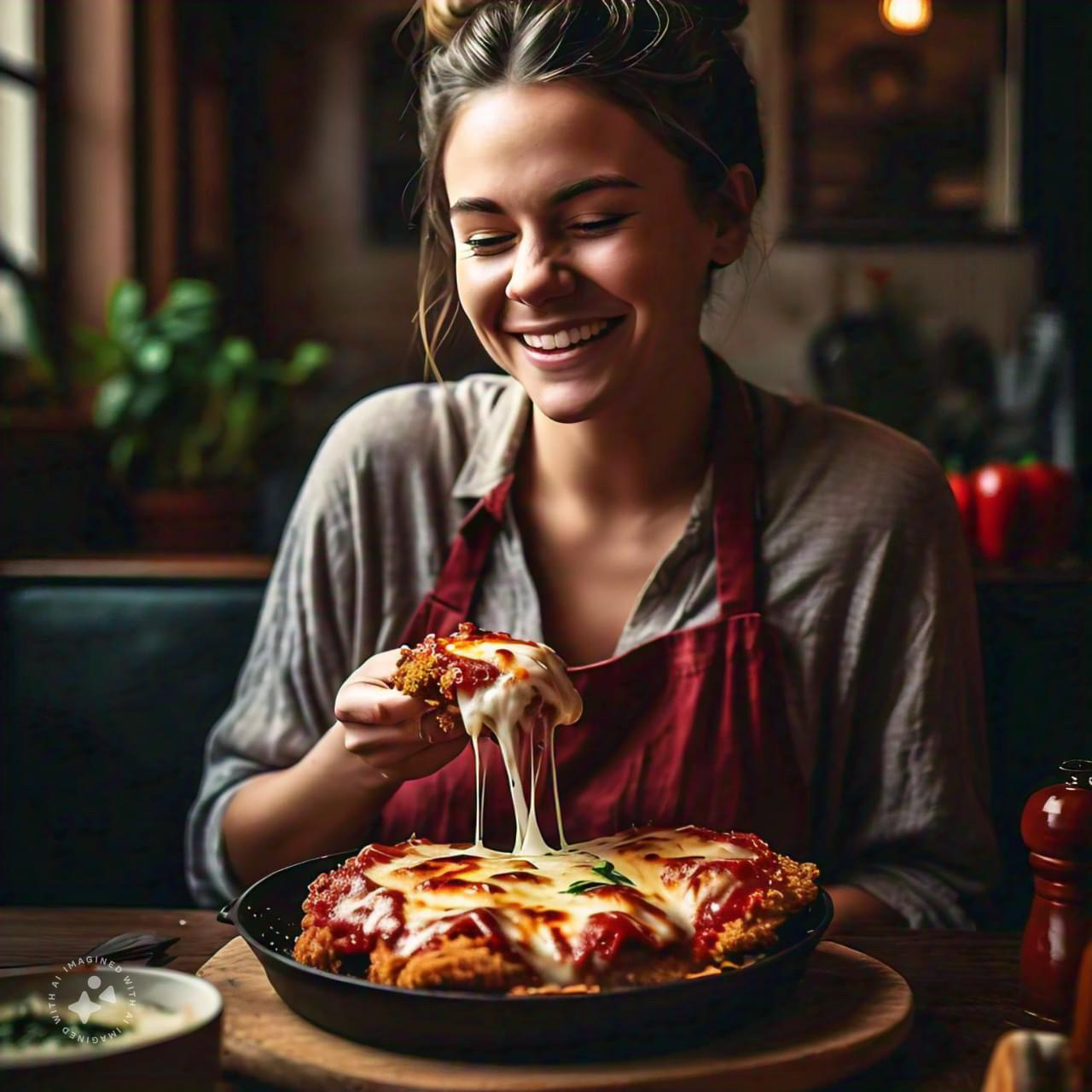 - Bread chicken with egg, breadcrumbs, Parmesan, and red pepper flakes.